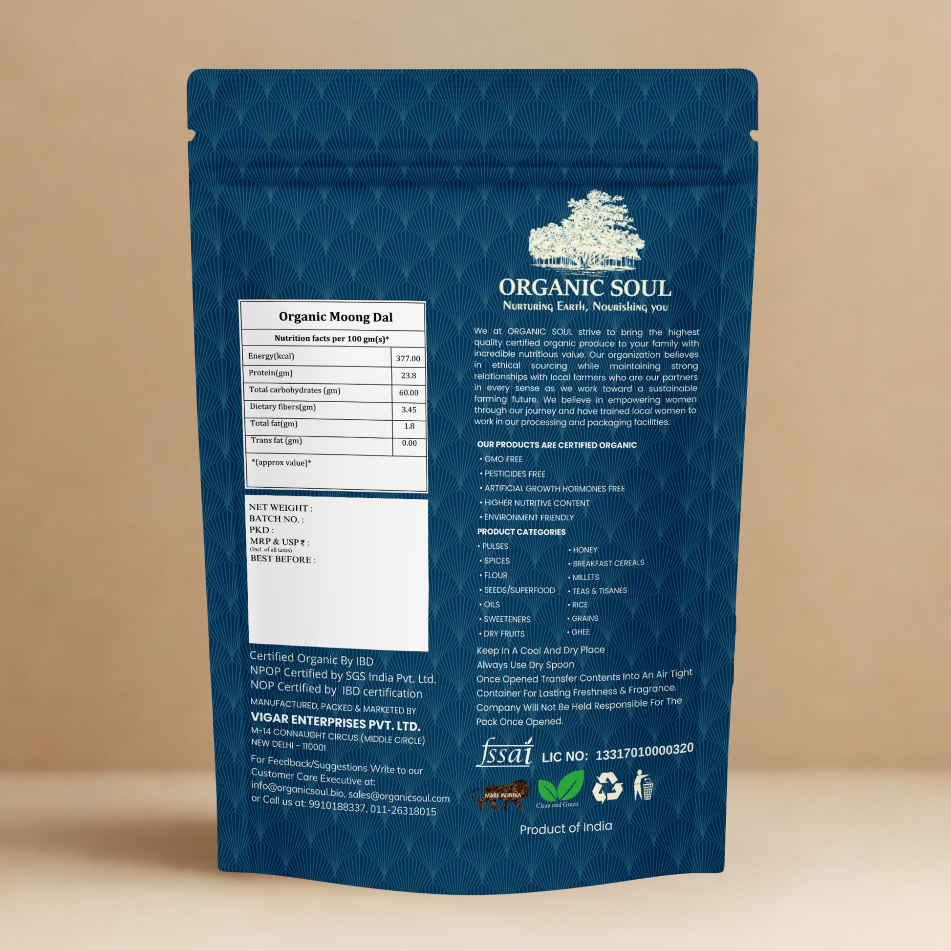 Organic Soul Moong Chilka is carefully sourced from certified organic farms where traditional and sustainable agricultural practices are followed. This variety is unpolished, which means it retains its natural nutrients, fiber, and authentic earthy flavor, unlike polished counterparts that lose their goodness during processing. Being Non-GMO and free from harmful chemicals, it offers you a safe, natural, and nutrient-rich option for daily cooking.