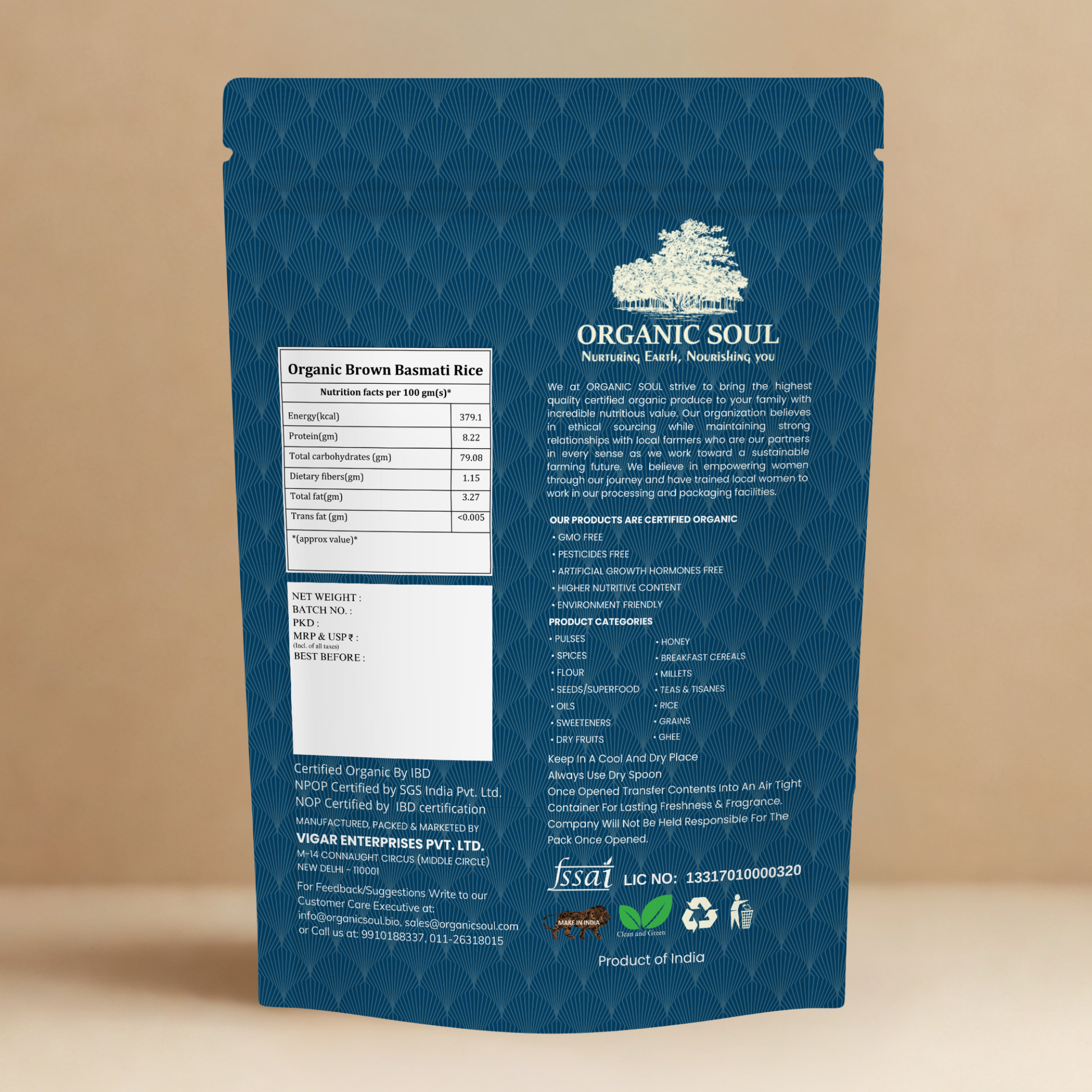 Its earthy flavor and slightly chewy texture add both taste and nourishment to your meals. Whether paired with dals, curries, or used for pulao, it delivers both health and authenticity in every bite. Grown on certified organic farms without harmful chemicals, it is a safe, pure, and sustainable choice. Hygienically packed in 900gm packs, Organic Soul Brown Basmati Rice ensures freshness and authenticity in every serving.