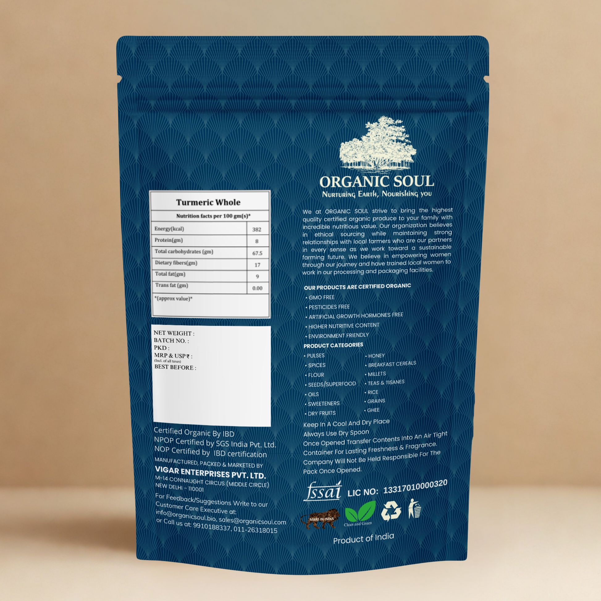 Organic Soul Turmeric Whole is organically grown and naturally dried to preserve its golden color, earthy aroma, and powerful curcumin content. Celebrated in Ayurveda, turmeric is known as a natural healer that supports immunity, detox, and overall wellness.